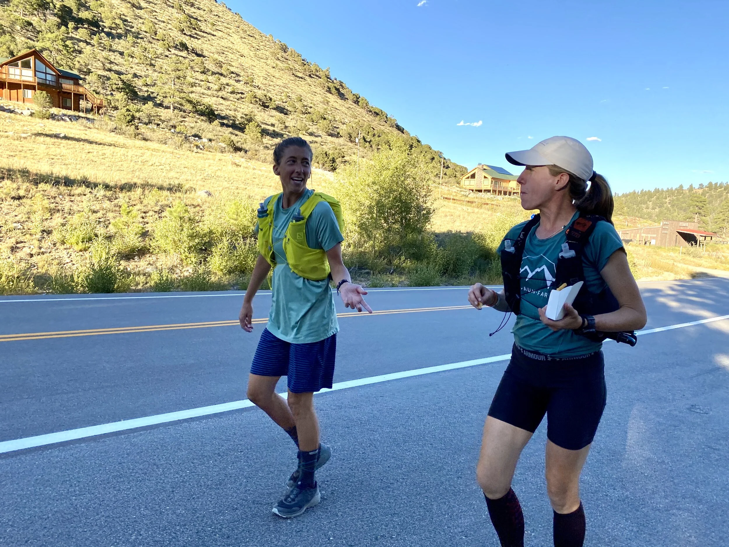Meghan Hicks with pacer Courtney Dauwalter during her Nolans 14 FKT. Also ft fries.