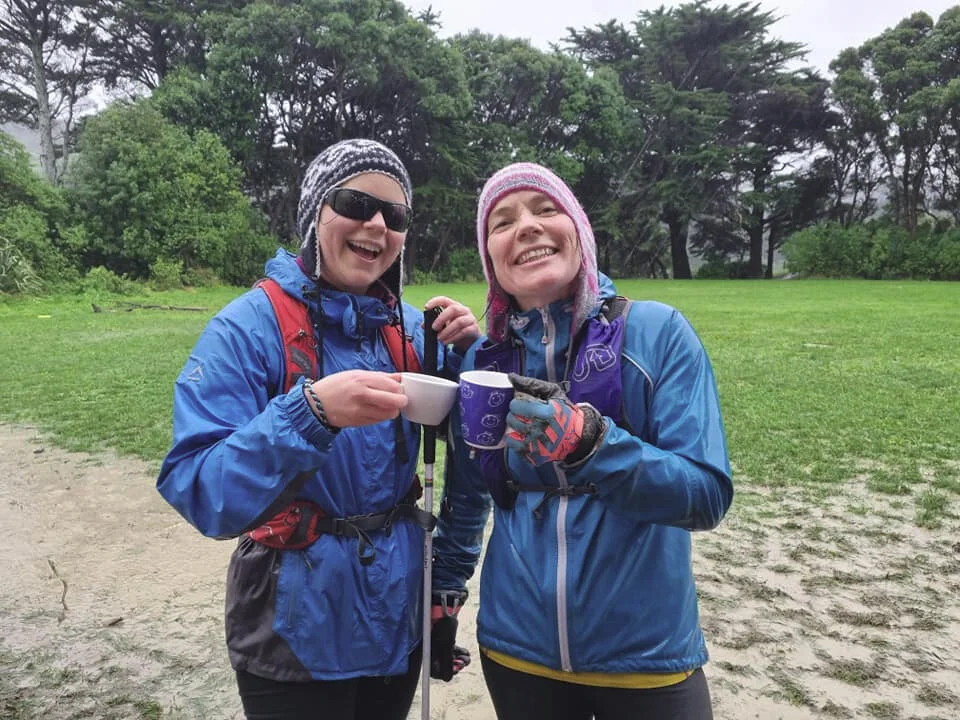 WUU2K 2021: Mary Fisher, left, and Carrie Buckmaster (guide), right, clinking mugs at an aid station. You can just see the tether they sometimes use on wider trails on Mary’s right hand…a looped piece of twined together fabric. Between them is Mary’s regular cane which they used nearly all of WUU2K so she could keep as close to Carrie’s line as possible